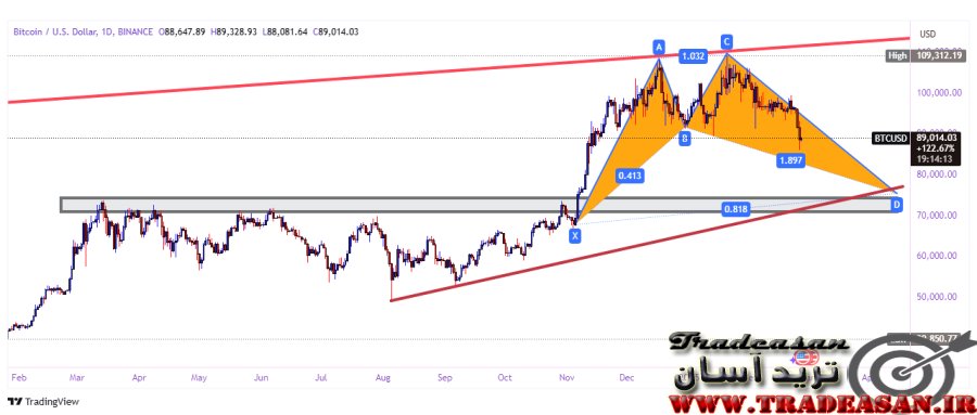 در نمودار روزانه (تصویر شماره دو)، قیمت دو مرتبه به سطح 109,000 دلار نزدیک شده اما موفق به شکست این مقاومت قدرتمند نشده است. این برخوردها که در دسامبر 2024 و 20 ژانویه 2025 رخ داده، منجر به شکلگیری الگوی سقف دو قلو و همچنین الگوی هارمونیک گارتلی شدهاند.