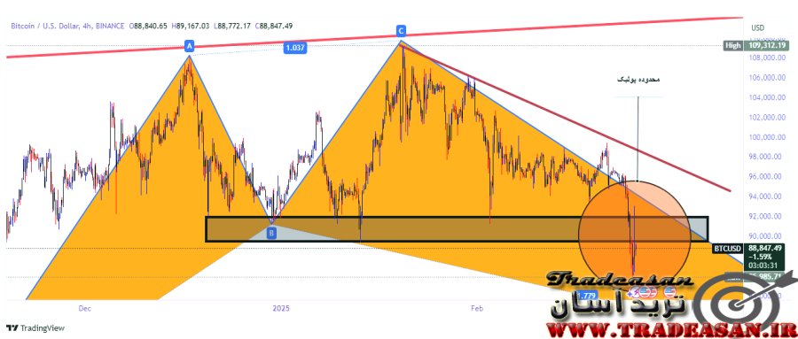 در تصویر شماره چهار، مشاهده میشود که قیمت پس از برخورد به ناحیه حمایتی گردن الگوی سقف دو قلو و گارتلی در محدوده 90,000 تا 92,000 دلار، این سطح را شکست و تا 85,985 دلار ریزش کرد. اکنون این منطقه که پیشتر حمایت محسوب میشد، به مقاومت تبدیل شده است.