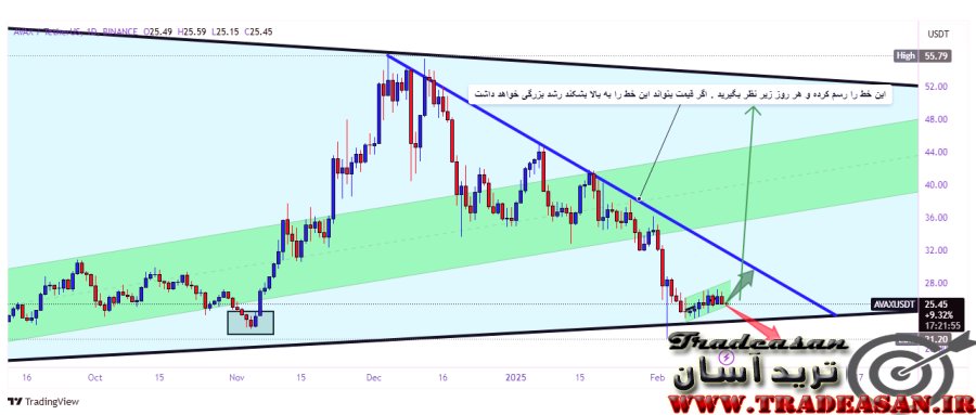 در جمع بندی شما را دعوت می کنم تا به تصویر بالا دقت کنید ( شماره 6 ) در تصویر بالا ، میتوان آینده روند رمز ارز را تشخیص داد . بی تردید ، قیمت در نقطه بسیار مهمی قرار دارد . در این نقطه به هیچ صورتی توصیه ای به خرید این رمز ارز نداریم و توصیه می کنیم فقط زیر نظر داشته باشید و تنها در صورتی این رمز ارز را بخرید که قیمت ، خط آبی روند نزولی را به بالا بشکند . البته نباید انتظار داشت که این وضعیت به سرعت شکل بگیرد ولی چنانچه قیمت در محدوده کنونی درون کانالی که در تصویر شماره 4 بررسی کردم ، به صورت افت و خیزهای کم نوسان جرکت نماید ، میتوان بسیار مطمعن شد که قیمت توانایی رشد دوباره خواهد داشت . زیرا نقطه کنونی بسیار پر مقاومت است و بر قیمت فشار وارد می کند تا سریعتر روند ریزشی عمیق را پی بگیرد و به زیر 23 دلار وارد شود که محدوده 8 دلار را مد نظر خواهد داشت . لذا در نقطه کنونی از خرید و فروش اجتناب کنید و در صورت شکست خط روند نزولی میتوانید با ریسک بسیار کمی وارد این رمز ارز شده و سود بسیار خوبی را بدست آورید ولی در صورتیکه قیمت تا 23 دلار ریزش داشت ، اگر این رمز ارز را قبلا خریداری کرده اید ، فقط توصیه به خروج کامل از رمز ارز آوالانچ برای مدتی خواهیم داشت تا بتوانید در محدوده پایینتر وارد شوید .