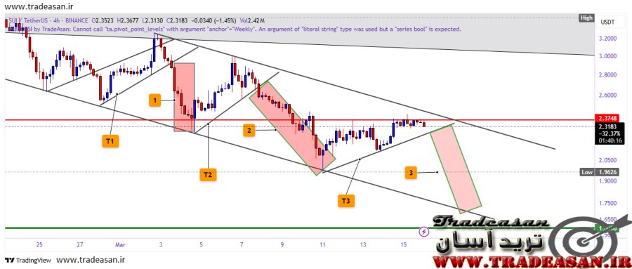 با شکسته شدن خط روند T3 شاهد ریزش سریع قیمت به پایین 2 دلار خواهیم بود.