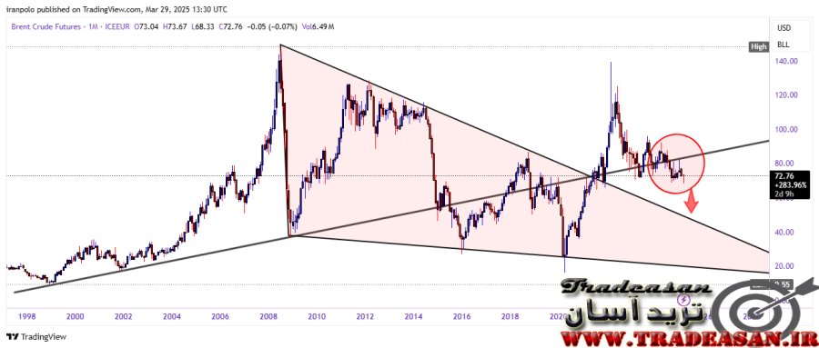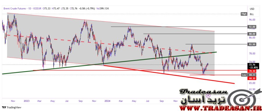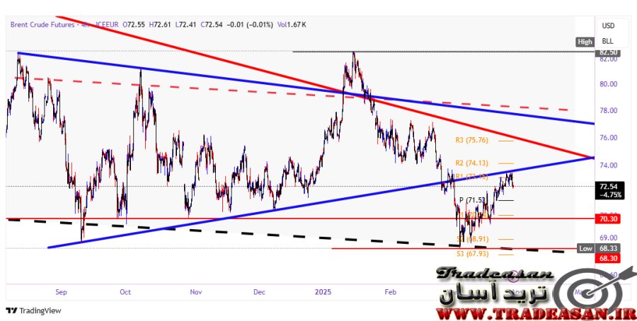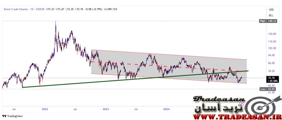 - روند کلی : در چارت شماره 3 بخشی از روند نفت برنت را از نیمه سال 2021 تا 29 مارس 2025 مشاهده می فرمایید. مطابق چارت، بالاترین قیمت در سال 2022 در محدوده 139 دلاری قرار داشته و کف قیمت نیز در 63 دلار می باشد. آخرین قیمت در چارت نیز 72.76 دلار در 29 مارس 2025 میباشد. لذا مطابق چارت، خط روندی متمایل به صعودی داریم که سه بار شکسته شده. اولی در اواخر سال 2024 شکسته شده و مجددا با نزدیک شدن به ژانویه، وارد خط روند اصلی خود شده و آخری در فوریه 2025 شکسته شده که همینک، قیمت در پایین ترند لاین قرار دارد. ما در تصویر بعدی، بررسی دقیقترین در اینباره خواهیم داشت.