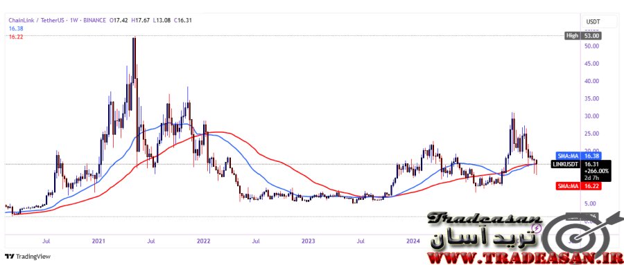 در تایم فریم هفتگی هشتیم ، همینک قیمت LINK در محدوده 16.31 دلار نوسان دارد. در چارت بالا از دو میانگین متحرک ساده ( simple ) استفاده شده تا روند آتی را بهتر تشخیص دهیم . تحلیل میانگینهای متحرک نشان میدهد که: